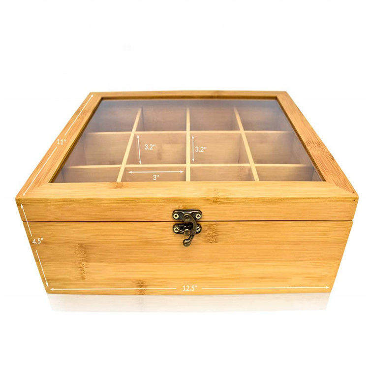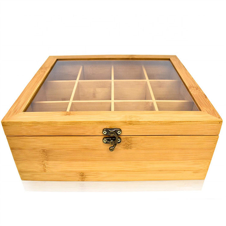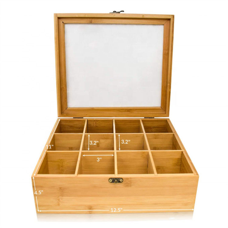| Nome di prodotto | scatola di di legno di bambù il tè di stoccaggio di 12 compartimenti di tè della bustina di regalo dell'organizzatore solido su ordinazione naturale del contenitore con il coperchio trasparente |